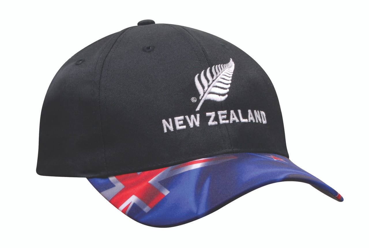 Show your Kiwi pride with this breathable poly twill cap. The NZ flag peak design makes a bold statement. The structured, low profile six panel design, pre curved peak, and short touch strap ensure a comfortable and easily adjustable fit. Made from breathable poly twill for comfort.