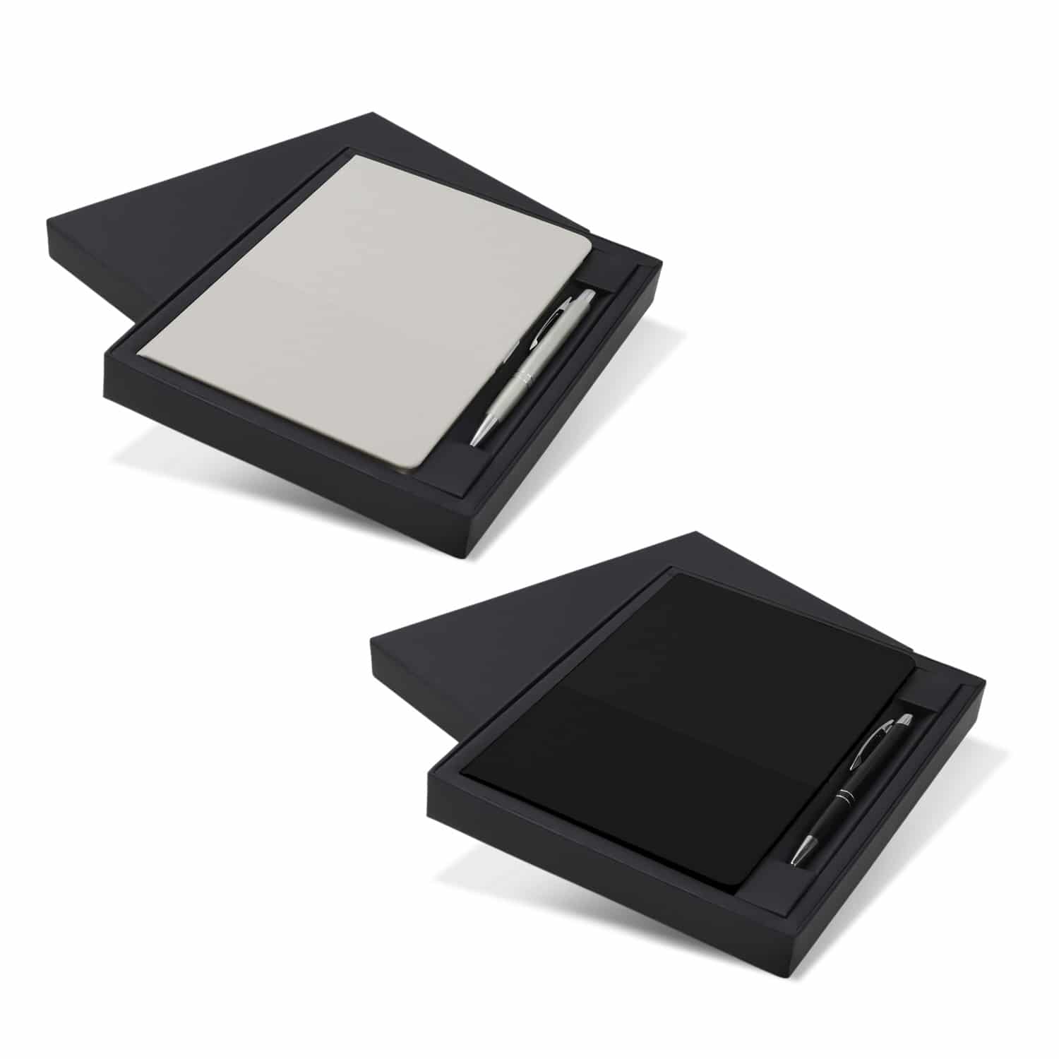A coordinated notebook and pen set with timeless style. The medium-sized (approximately A5) Harvard notebook is made almost entirely from recycled materials and features a textured PU hard cover, 80 leaves of 70gsm lined natural paper, and a matching elastic closure band, bookmark ribbon, and pen loop. It is paired with the Martini Pen, featuring a lacquered recycled aluminium barrel, shiny chrome trim, and 800 metres of black Dokumental ink for smooth, reliable writing. An optional paper belly band is available on request and can be branded in full colour. The notebook and pen set is presented in a black gift box.