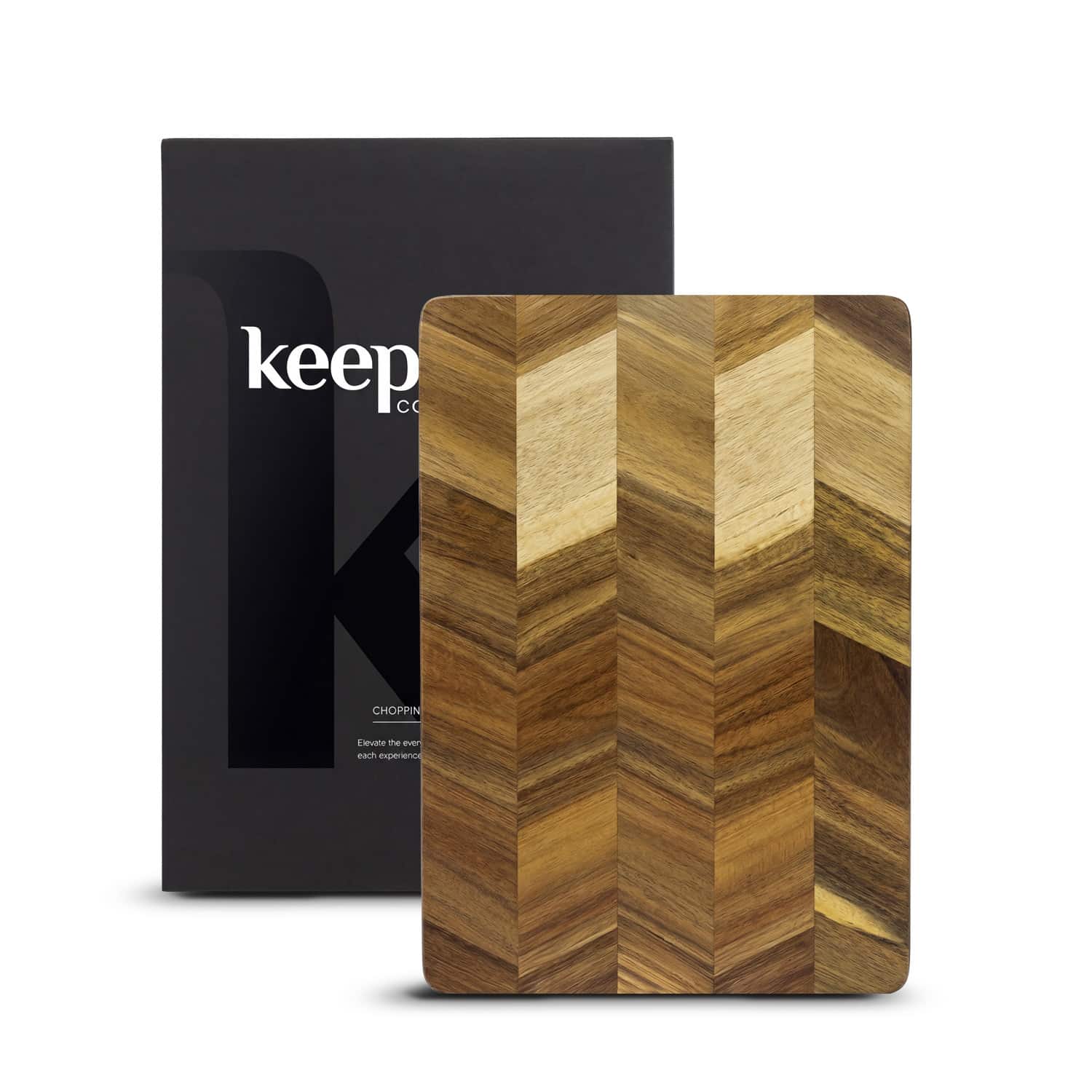 The Keepsake Chopping Board delivers practical function with refined design. A striking chevron pattern is created by alternating pieces of acacia in varying natural tones, making every board unique, while its natural durability ensures reliable performance in regular kitchen use. The Keepsake Chopping Board is beautifully presented in a natural gift box with a Keepsake branded sleeve.