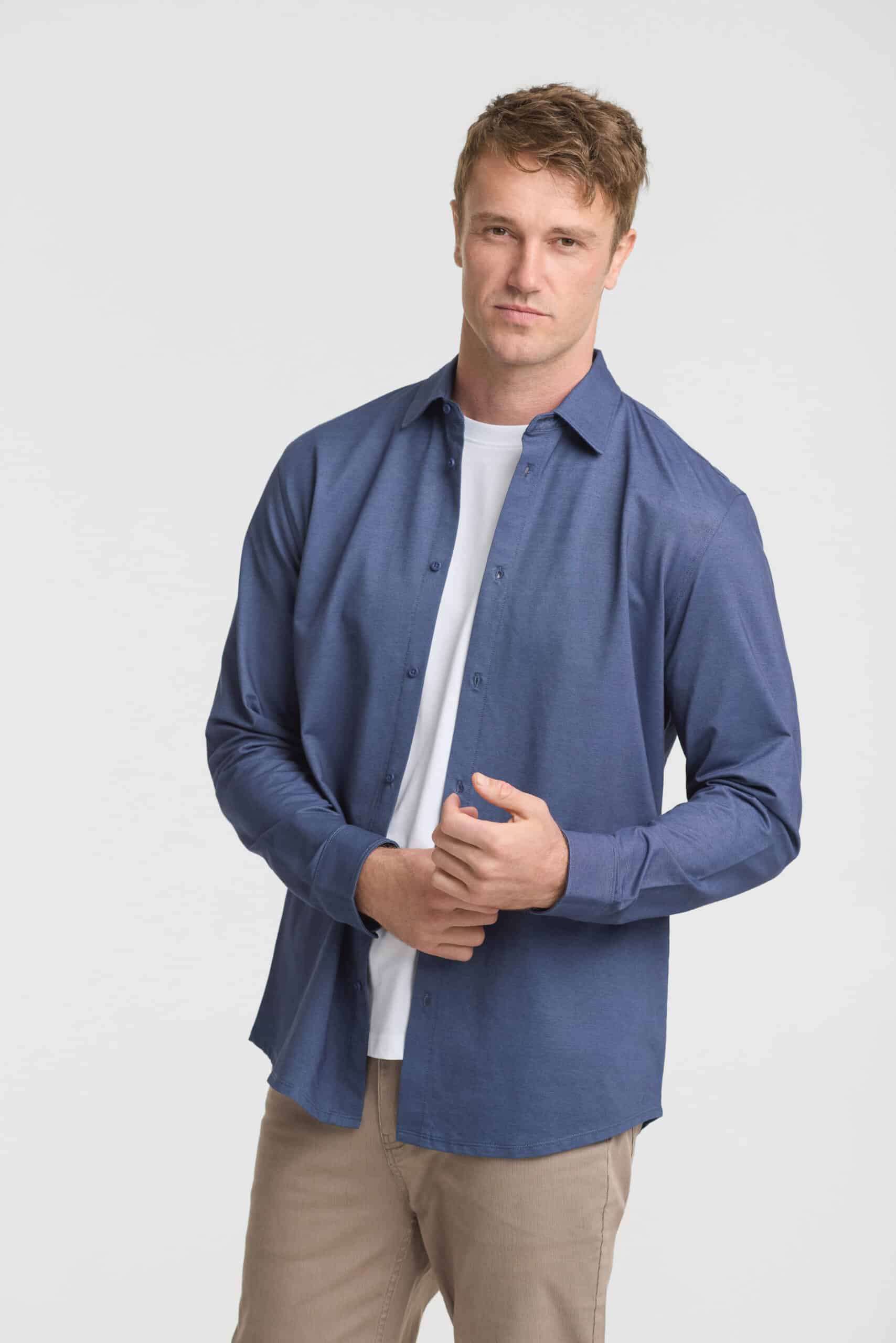 Sizes: S – 5XL; Fabric: 60% Cotton, 40% Polyester Sorona; 190 GSM; 4-Way stretch; Features: Stand collar,Grown-on placket,Full button-through front,Adjustable button cuffs,Contrast tape detail at the back neck,Mens style includes loose pocket;