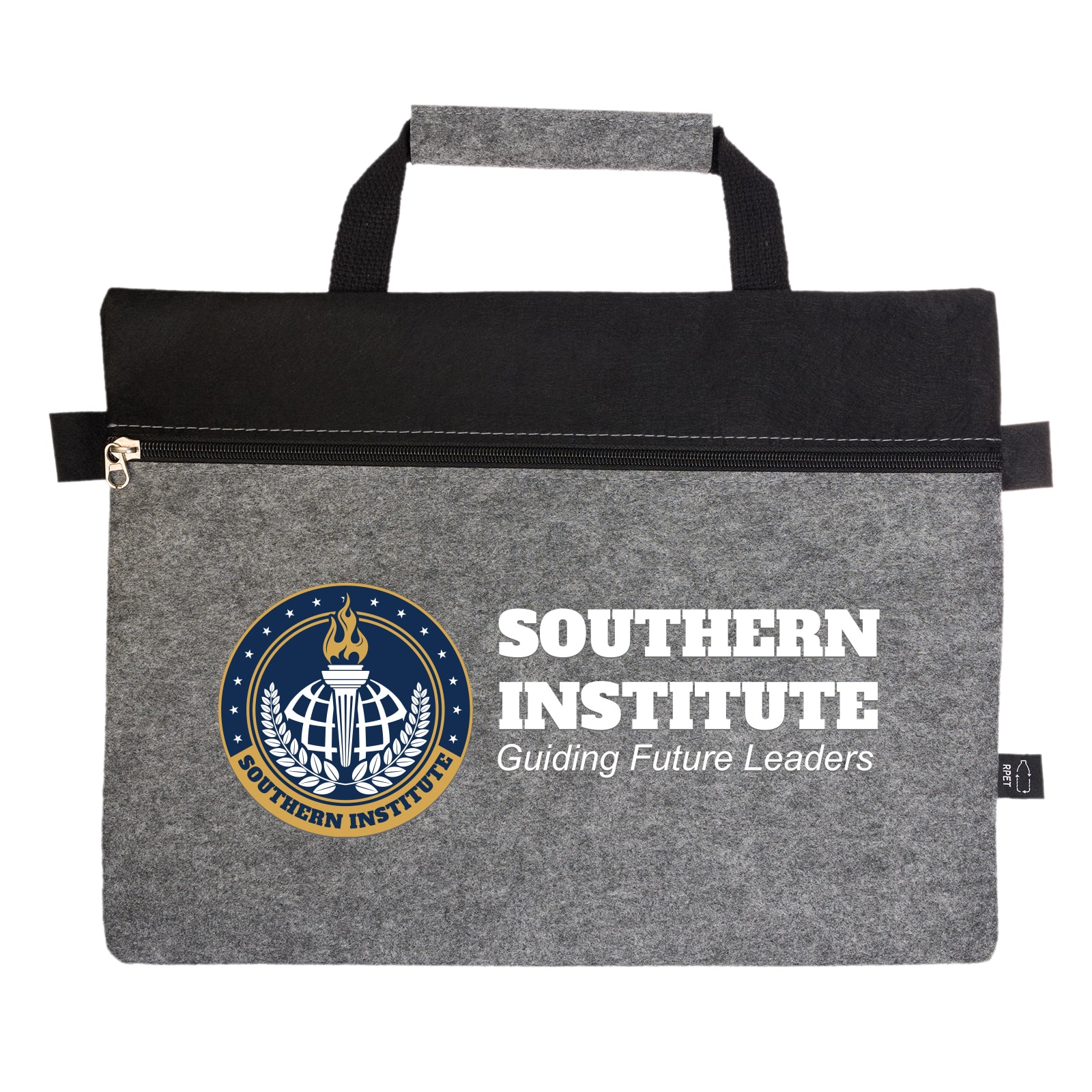 Zippered satchel made from 1mm RPET Felt with webbing carry handle. RPET material is produced from recycled 2L PET water bottles. Ideal for keeping documents secure. Eco Credentials Made from 1 and 1 4 recycled PET bottles, Reusable, Printed using renewable energy.