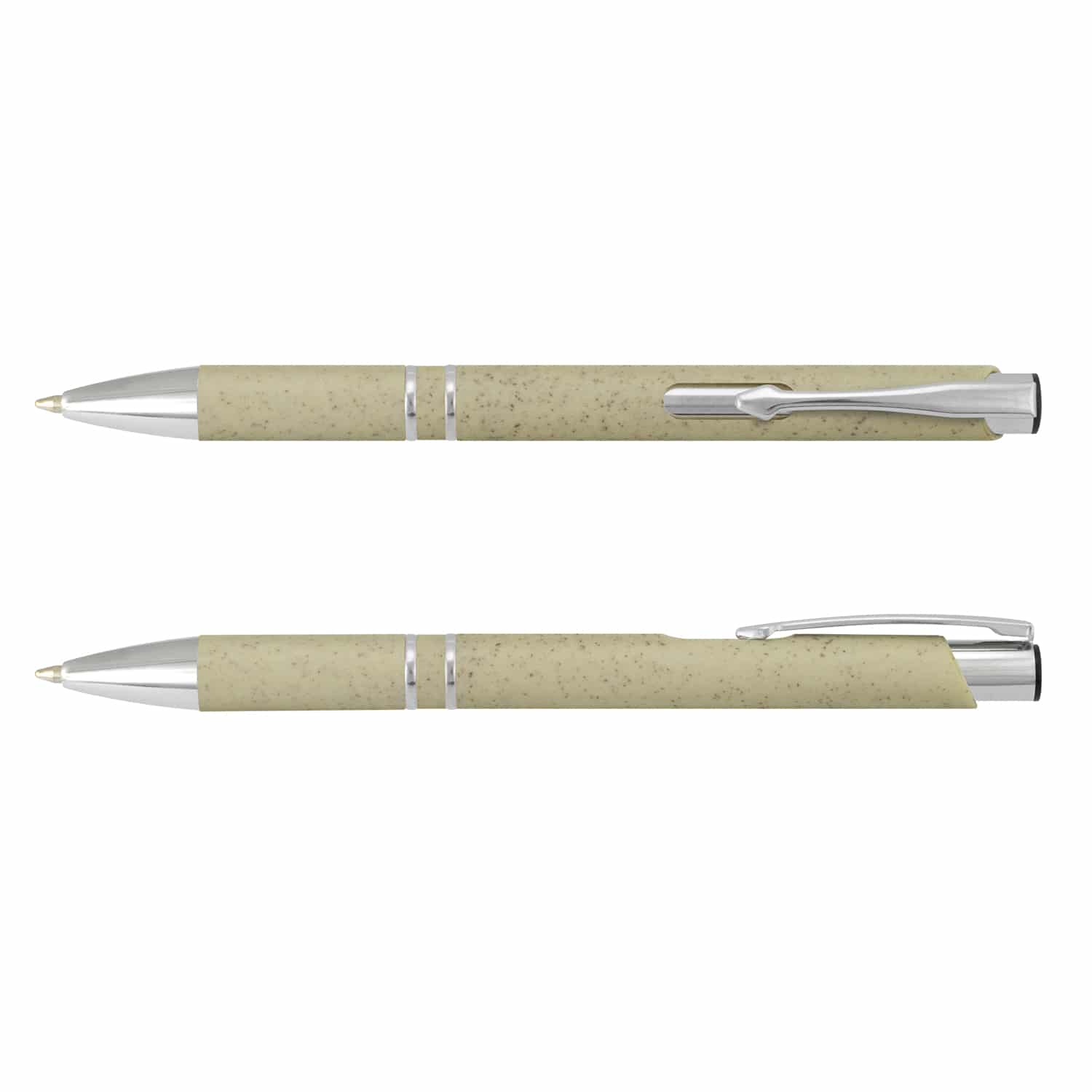 Retractable ballpoint made from a 50/50 blend of wheat straw fibre and ABS plastic with a matte finish and shiny chrome accents. It has a black large volume refill with 1200 metres of German manufactured Dokumental ink. Panama can be presented in an optional pen sleeve.