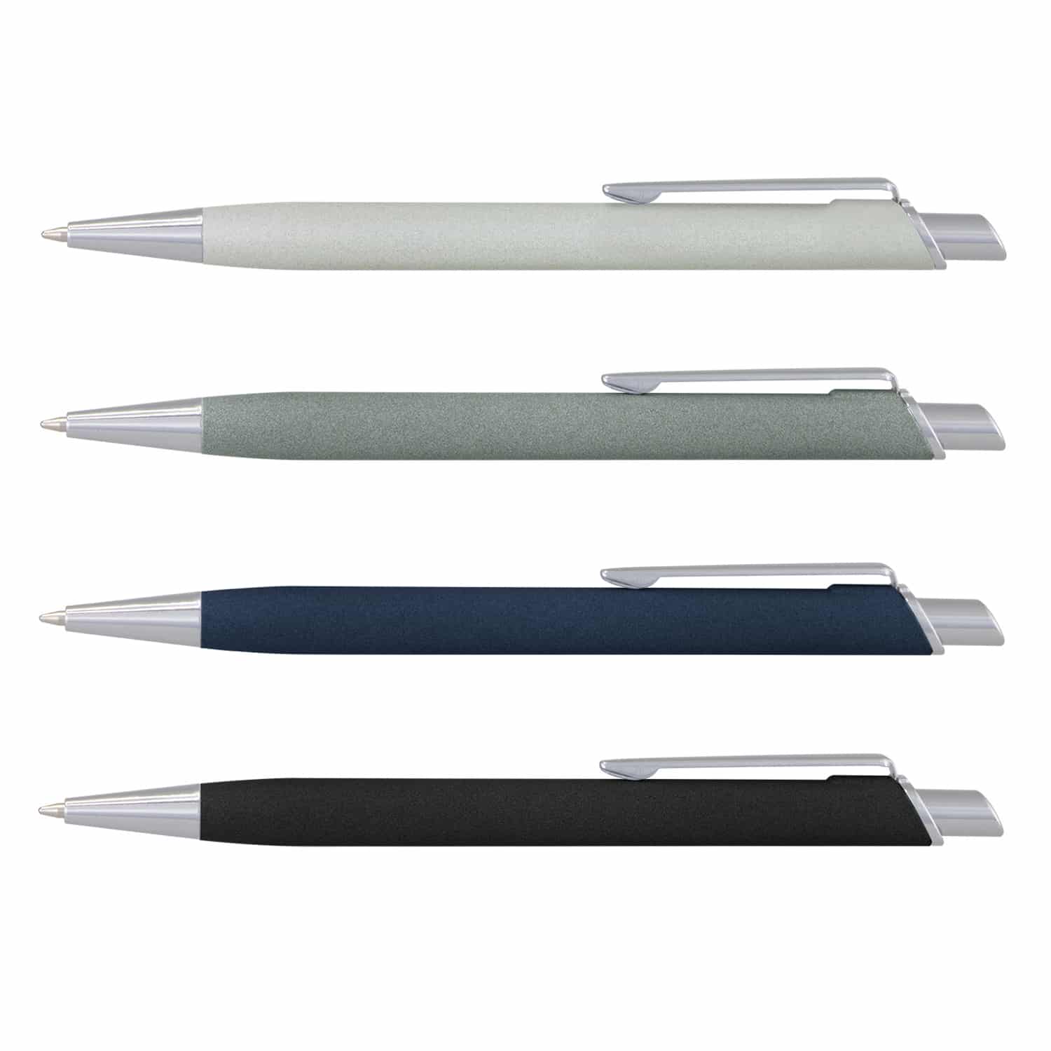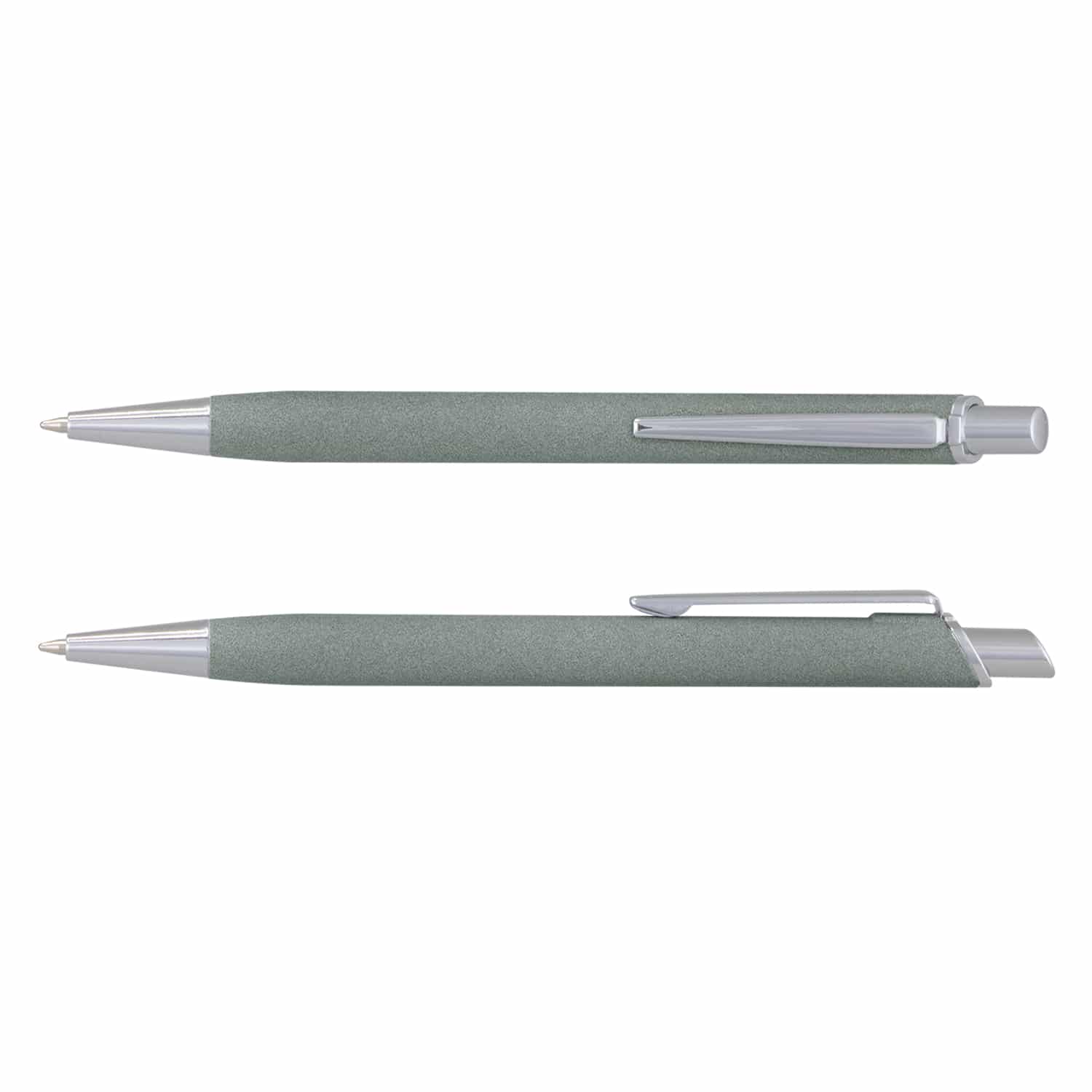 Retractable aluminium ballpoint pen with a unique stone-like textured finish and shiny chrome accents. It has a blue large volume refill with 1800 metres of writing ink and can be presented in an optional pen sleeve.