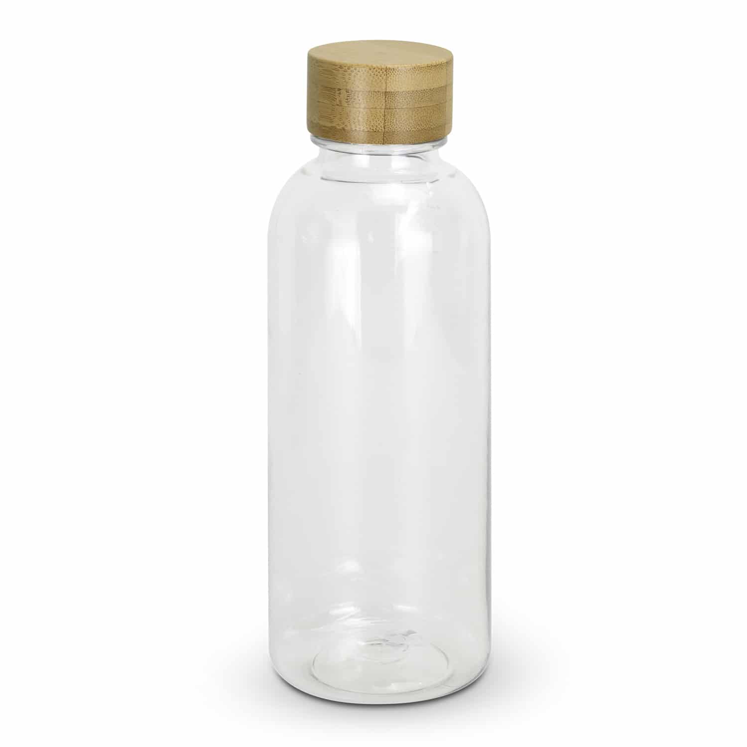 Handy 650ml clear bottle made from recycled polyethylene terephthalate (RPET) plastic. It features a bamboo natural lid with a silicone seal.