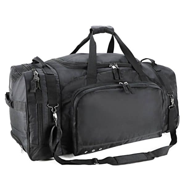 Large centre compartment with U-shaped opening One large zippered wet pocket at the left Front large zippered pocket with metal eyelets One small zippered pocket at the front Internal retractable trolley system Additional handle on both sides for easy carry Removable, adjustable shoulder strap and carry handle Studded base for durablility