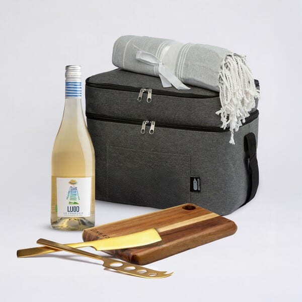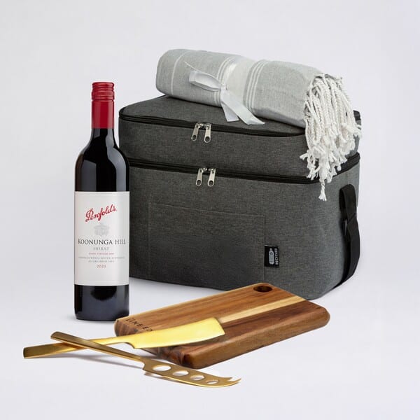Relaxed, refined, and ready to enjoy. A laid back blend of comfort and class. Inside the sleek grey cooler bag, youll find everything needed to wind down and ease into golden hour. A smooth acacia serving board and satin gold cheese knives set the scene, while a bottle of premium wine choose red or white brings the celebration. A soft Turkish style towel finishes the moment with practicality and polish perfect for park days, housewarmings, or gifts that feel both luxe and thoughtful.