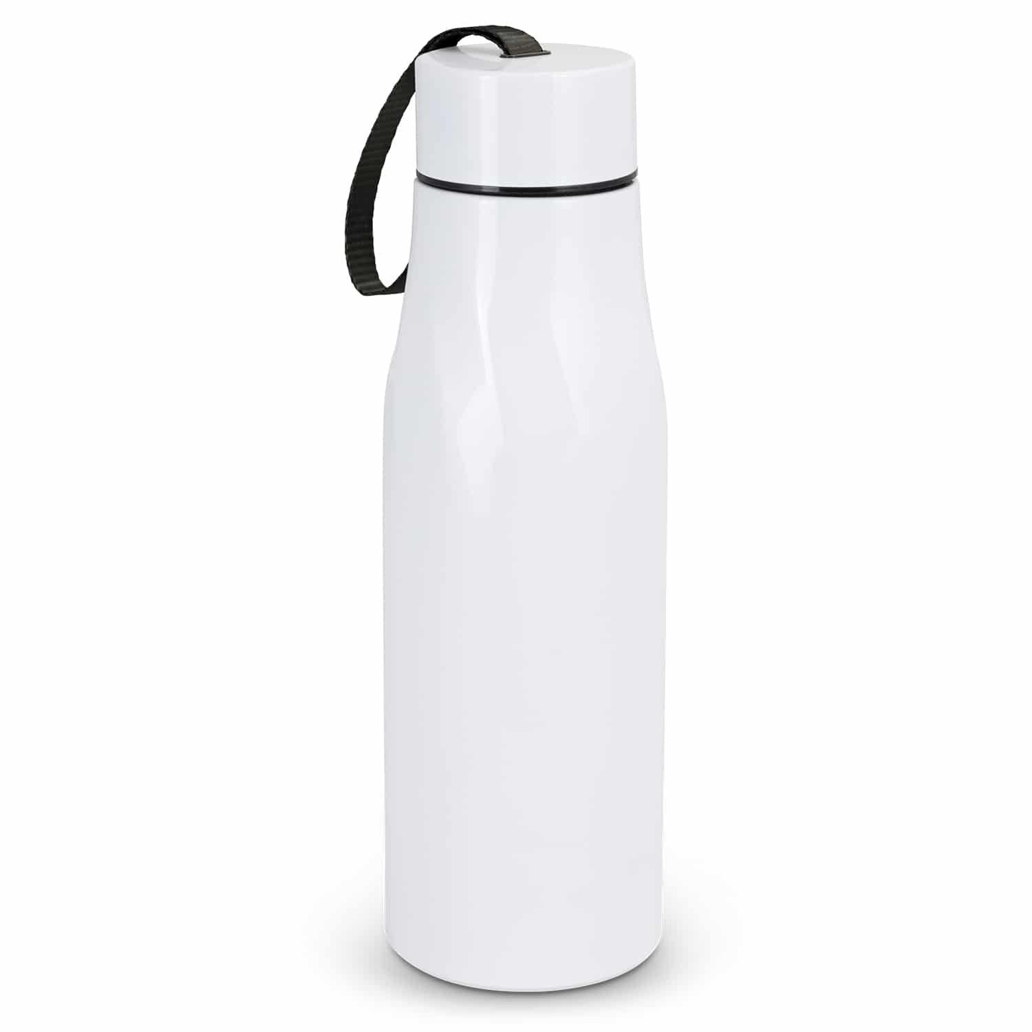 Fashion-inspired stainless steel 750ml bottle with a gloss finish. It has a screw-on lid with a black ribbon handle. Tornado is BPA-free. The bottle laser engraves to a shiny stainless steel finish. This product is not dishwasher safe, and handwashing is recommended.