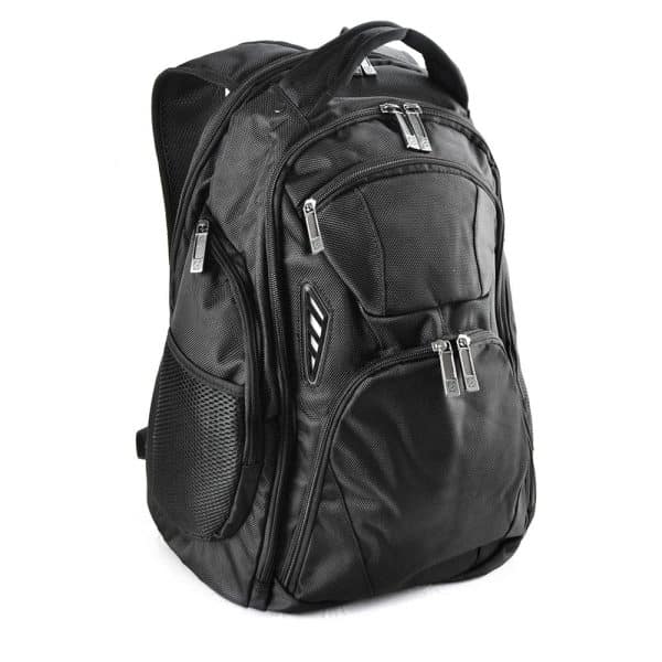 1680 denier nylon. Large main zippered compartment with laptop/tablet holder Second zippered compartment with inside pocket Front compartment with stationary organiser Front small zippered pocket and zippered pocket on both sides Elasticised mesh pocket on both sides and extra padding on back for comfort Adjustable padded backpack strap with mesh pocket for mobile phone.