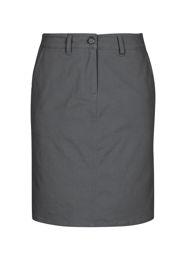 Sizes: 6 – 26; Extras: ; Fabric: 98% Cotton, 2% Elastane Stretch Fabric,240 GSM; Features: Garment washed for a soft lived-in feel,Curved waistband with 2 side angled pockets, 2 back patch pockets,Above knee length, slightly A-line skirt with back vent;