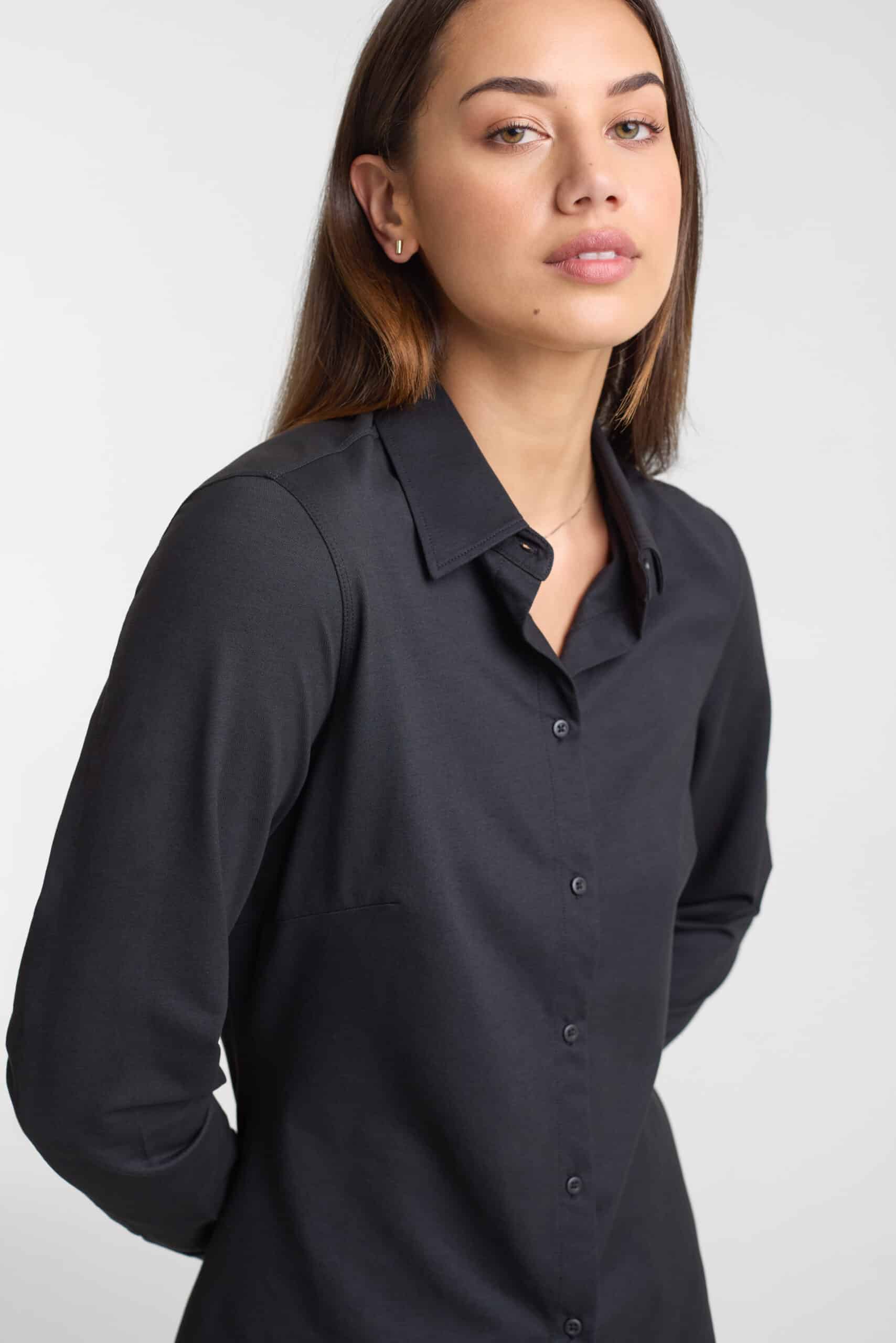 Sizes: 6 – 24; Fabric: 60% Cotton, 40% Polyester Sorona; 190 GSM; 4-Way stretch; Features: Stand collar,Grown-on placket,Full button-through front,Adjustable button cuffs,Contrast tape detail at the back neck;
