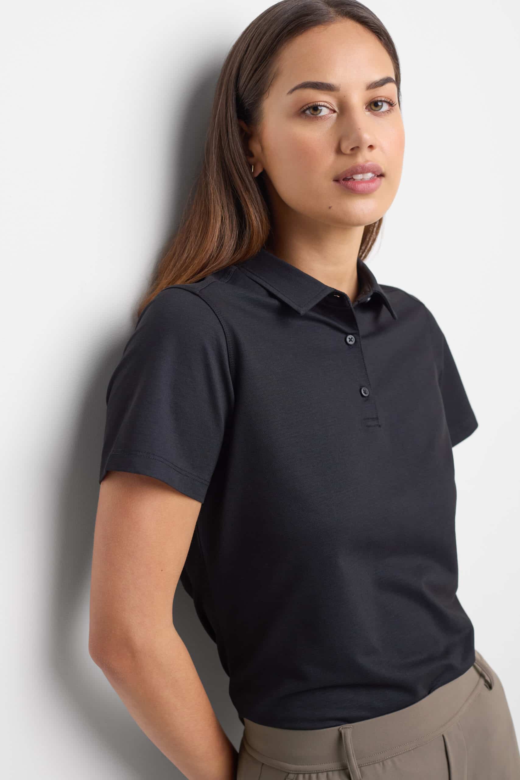 Sizes: 6 – 24; Fabric: 60% Cotton, 40% Polyester Sorona; 190 GSM; 4-Way stretch; Features: Two-piece self-fabric collar with stand,3-button standard placket,Straight hem,Contrast tape detail at the back neck;